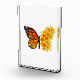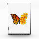 Orange, detailed monarch butterfly with wing decorated with yellow, vibrant California poppy on white background.