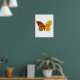 Orange, detailed monarch butterfly with wing decorated with yellow, vibrant California poppy on white background.