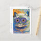 A fine art postcard with an animal illustration of a long-haired cat with purple flowers around the eyes, by the British artist Louis Wain (1860-1939). He was an illustrator best known for his drawings of cats during the art nouveau period.