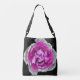 This image is a digital watercolor pink and white flower on a black background on a Crossbody Bag.