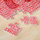 Puzzle in a mixed pattern digital graphic of a flower embellished elephant against an arabesque tiled background - flower pattern in shades of deep red, coral and white