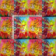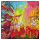 Whimsical ,colourful ,vibrant enchanted flower fairies in the moon light .Acrylic -watercolor painting with gold sparkles and iridescent colours. .A vibrant magic flower in bright pink orange yellow blue,teal colours with golden and silver foil