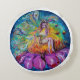Colourful and whimsical faery sitting on a pink fuchsia flower in gold sparkles .Acrylic painting in white,pink blue green yellow colours ,golden and silver foil with iridescent colours . (c) by Bulgan Lumini