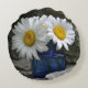 Each side of this pillow features a different image. One side features rich red coloured impatiens in a wine barrel and the other side features white daises in a cobalt ink bottle resting in a rock garden