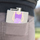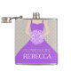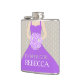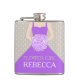 Elegant graphic flower girl in a rich purple dress in holding a posy of purple lilac stylised roses wedding hip flask. Reads Flower girl Rebecca. Personalise with your own name and title. A great gift idea for bridal showers, hen nights or wedding rehearsals.