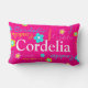 Cute bright pink, green blue aqua, yellow and white patterned up to 8 letter personalised name pillow. Customise with your own name currently reads Cordelia. Background colour can also be changed if required currently bright hot pink. A perfect gift for girls to personalise their room. Original art and design by Sarah Trett exclusively for www.mylittleeden.com