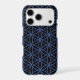 The flower of life symbol in a repeat pattern in blue detail on a black background.