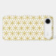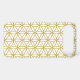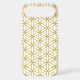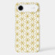The flower of life symbol in a repeat pattern in gold detail on a white background.
