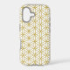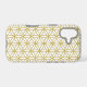 The flower of life symbol in a repeat pattern in gold detail on a white background.
