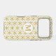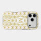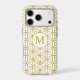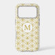 The flower of life symbol in a repeat pattern with a center circled initial for a personalized item in gold detail on a white background.