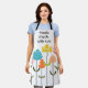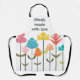 This apron has a mid-century modern design of flower made from squares, ovals, and diamonds that have been manipulated to form flowers.