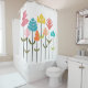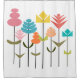 This shower curtain has a mid-century modern design of flower made from squares, ovals, and diamonds that have been manipulated to form flowers.