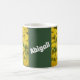 This tea or coffee mug adds both a hint of nature and a whole lot of vibrant colour to your morning. The photo features a collection of delicate bright yellow flower blooms with a handful of small and delicate flower buds. The same photograph appears on both sides of this morning coffee mug with a dark green solid area in the centre for your name or any other text you wish to add.
