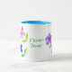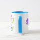 A chic white coffee mug with blue lip and handle, decorated with a floral motif, from a handpainted paper collage by Judy Adamson.