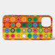 Different coloured flowers arranged in a row against a different coloured background in the colour of the 70s, the hippies.