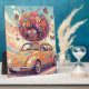 A joyful woman with massive curly hair made of colorful flowers, laughing as she drives a vintage yellow Volkswagen Beetle covered in floral patterns. Butterflies flutter around her, and sunlight glows softly. The scene radiates happiness, freedom, and boho vibes. Vibrant psychedelic digital art in retro 1970s pop-art style.
