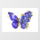 Jewellery, blue, sapphire, sparkling flower butterfly with wing decorated with blue, precious flowers with gold leaves on white background.