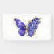 Jewelry, blue, sapphire, sparkling flower butterfly with wing decorated with blue, precious flowers with gold leaves on white background.