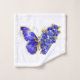 Jewelry, blue, sapphire, sparkling flower butterfly with wing decorated with blue, precious flowers with gold leaves on white background.