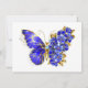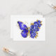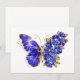 Jewellery, blue, sapphire, sparkling flower butterfly with wing decorated with blue, precious flowers with gold leaves on white background.
