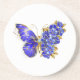 Jewellery, blue, sapphire, sparkling flower butterfly with wing decorated with blue, precious flowers with gold leaves on white background.