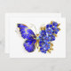 Jewellery, blue, sapphire, sparkling flower butterfly with wing decorated with blue, precious flowers with gold leaves on white background.