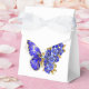 Jewellery, blue, sapphire, sparkling flower butterfly with wing decorated with blue, precious flowers with gold leaves on white background.