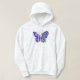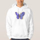 Jewelry, blue, sapphire, sparkling flower butterfly with wing decorated with blue, precious flowers with gold leaves on white background.