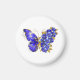 Jewellery, blue, sapphire, sparkling flower butterfly with wing decorated with blue, precious flowers with gold leaves on white background.
