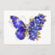 Jewellery, blue, sapphire, sparkling flower butterfly with wing decorated with blue, precious flowers with gold leaves on white background.