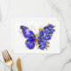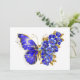 Jewellery, blue, sapphire, sparkling flower butterfly with wing decorated with blue, precious flowers with gold leaves on white background.