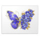 Jewelry, blue, sapphire, sparkling flower butterfly with wing decorated with blue, precious flowers with gold leaves on white background.