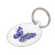 Jewellery, blue, sapphire, sparkling flower butterfly with wing decorated with blue, precious flowers with gold leaves on white background.