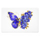 Jewellery, blue, sapphire, sparkling flower butterfly with wing decorated with blue, precious flowers with gold leaves on white background.