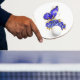 Jewellery, blue, sapphire, sparkling flower butterfly with wing decorated with blue, precious flowers with gold leaves on white background.