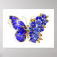 Jewellery, blue, sapphire, sparkling flower butterfly with wing decorated with blue, precious flowers with gold leaves on white background.