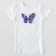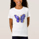 Jewellery, blue, sapphire, sparkling flower butterfly with wing decorated with blue, precious flowers with gold leaves on white background.