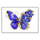Jewellery, blue, sapphire, sparkling flower butterfly with wing decorated with blue, precious flowers with gold leaves on white background.