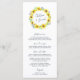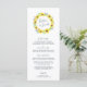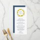 Our country chic wedding menu features your starter courses, entrees and desserts in elegant lettering, with your names encircled by a wreath of yellow watercolor sunflowers, green leaves and tiny navy blue buds. Coordinates with our Flowerfields wedding collection.