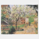 Flowering Plum Tree, Eragny. Camille Pissarro. Cute spring landscape in warm colours. The garden near the house is surrounded by a high fence. In the centre there is a flowering tree. A woman is walking along the road. Reproduction of famous works of art images in the public domain.