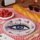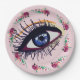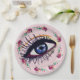 Elegant artsy custom paper plates. Blue eye drawing and watercolor flowers, custom background colour paper plates.