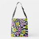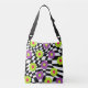 Super groovy cross body bag features funky flowers in shades of lime green , pretty purple , and hot pink, against an abstract black and white checked background.