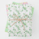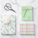 This spring-themed assortment of wrapping paper includes green on white ferns, a colourful spring plaid on white and flowers in triplicate on a pastel green background.