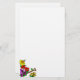 A stationery template for gardeners and flower lovers with a blooming daisy, sunflowers and violets in red, yellow and purple, with a bee, lady bug and a shovel.