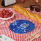 Flowers drawing, blue background, golden dots. Summertime mood. Anny occasions.Happy celebration paper plates.