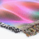 A quality printed throw has its advantages. This is a much finer weave throw than its loopier cousins, and though lighter, it is worth the investment for custom room accessorizing. The back is much prettier than the typical brown, and the fringe on the long sides very vivid, the selvage nicely done. Before photographing, I washed the throw in cold water, delicate, with a thicker woven throw the same size. On tumble dry low, this throw was dry in half the time as the other. This is a very practical quality if you use throws for furniture covers or to wrap up in frequently. The sleekness of the fabric makes it a great layer for accenting or protecting without the feeling of sitting on too much stuff. Perfect for napping or when you feel a light chill coming on. The color printing is beautiful and on this fabric, matched the design and color of my Photoshop image. This is an advantage for blending room fabrics and colors. The fringe on the short sides prints the colors from the design image and therefore varies from the side fringe. I streaked a white fractal line through the plaid pattern to give the illusion of weaving. This printed as crisp as an illusory thread, and put some white in the short side fringe, showing another advantage of print vs loomed- for artistic purposes, line lines, detail, and color integrity can be planned and preserved. My loomed throws have color limitations and more of a needlepoint texture. Print throws reproduce an exact image. The throw felt a little stiff straight out of the package, but this went away in the first delicate wash. Of course I searched the wash water for ink or bleeding and there was none.