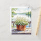 Pretty postcard with a beautiful illustration of white flowers in a copper pot with a back view of a serene lake with pine trees. Keep in touch with a friend or family member with this beautiful postcard.