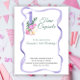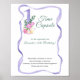 Birthday invitation card featuring watercolor illustration of number one with wild flowers and purple ribbon.