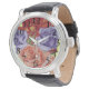 This original flower painting of a peach rose, a red rose and a blue rose is painted in water-colour. The pretty bunch of colourful flowers look great on this original watch. The delicateness of the rose artwork really stands out on this cool accessory. the black straps, black keeper and black numbers add to the vibrents of this unique time piece. I think this trendy customisable black floral fashion watch make a really lovely gift for anyone, especially someone who loves roses and other pretty flowers, but maybe you simply want to spoil yourself to very special black rose watch.