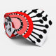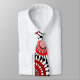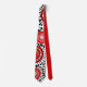 This necktie has a design of rings and circles in shades of red with black lines crossing behind them forming flowers on a field of white.